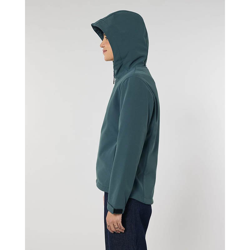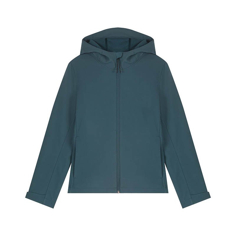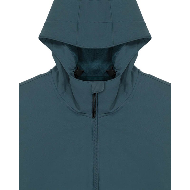 Set-in sleeve High collar and panelled hood Hood opening and bottom hem with adjustable plastic stopper and elastic cord Reverse nylon zip at center front Zipped welt pockets with reflective elastic puller Fully bonded 3 layer fabric with recycled TPU