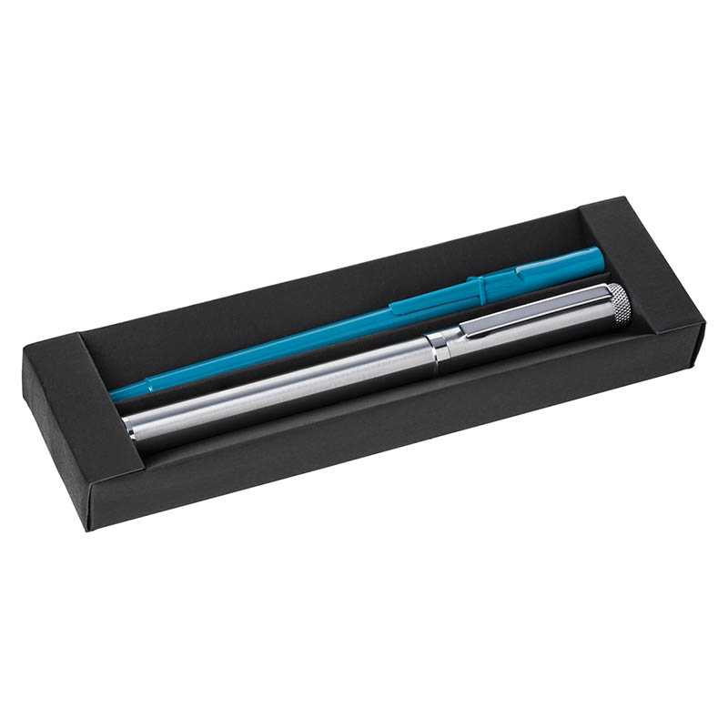 Sada pera z recyklovaného hliníku s rollerem a kuličkovým perem v černé papírové dárkové krabičce. S modrou náplní.