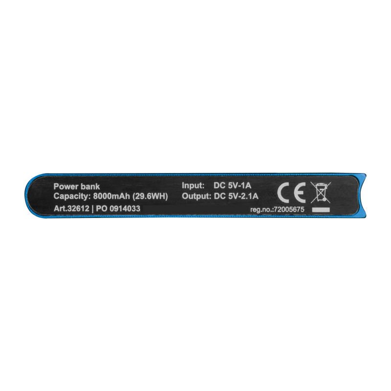 Hliníkový Power Bank s kapacitou 8000 mAh, indikátorom stavu nabitia, micro USB káblom.