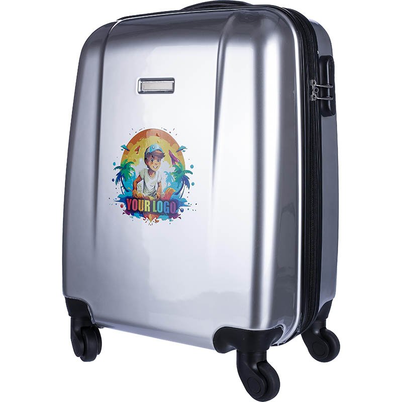 PC/ABS hard case trolley with four wheels, extendable handle, and integrated number lock. Includes metal plate for engraving purposes.