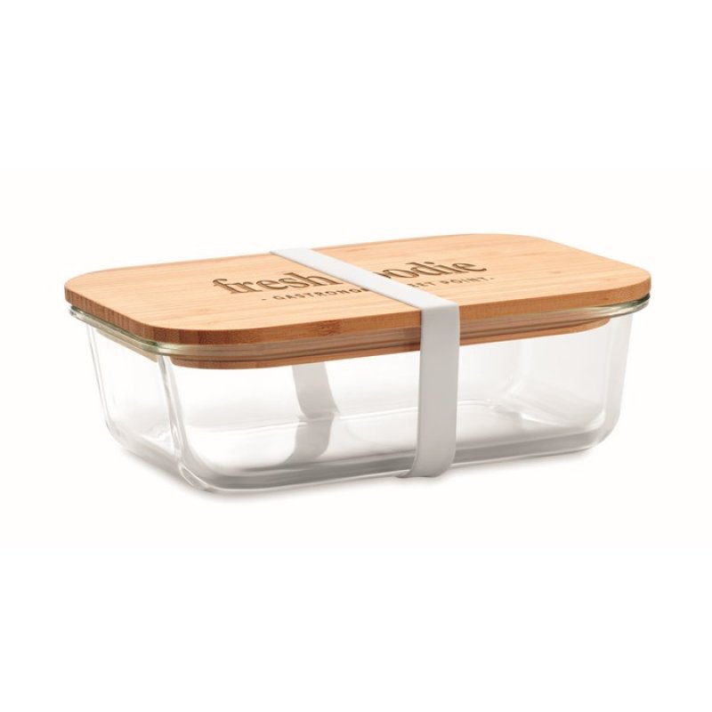 Skleněný box na jídlo s víkem z přírodního bambusu. Se sadou příborů z bambusu (nůž, vidlička a lžíce) a elastickým páskem, 500 ml.