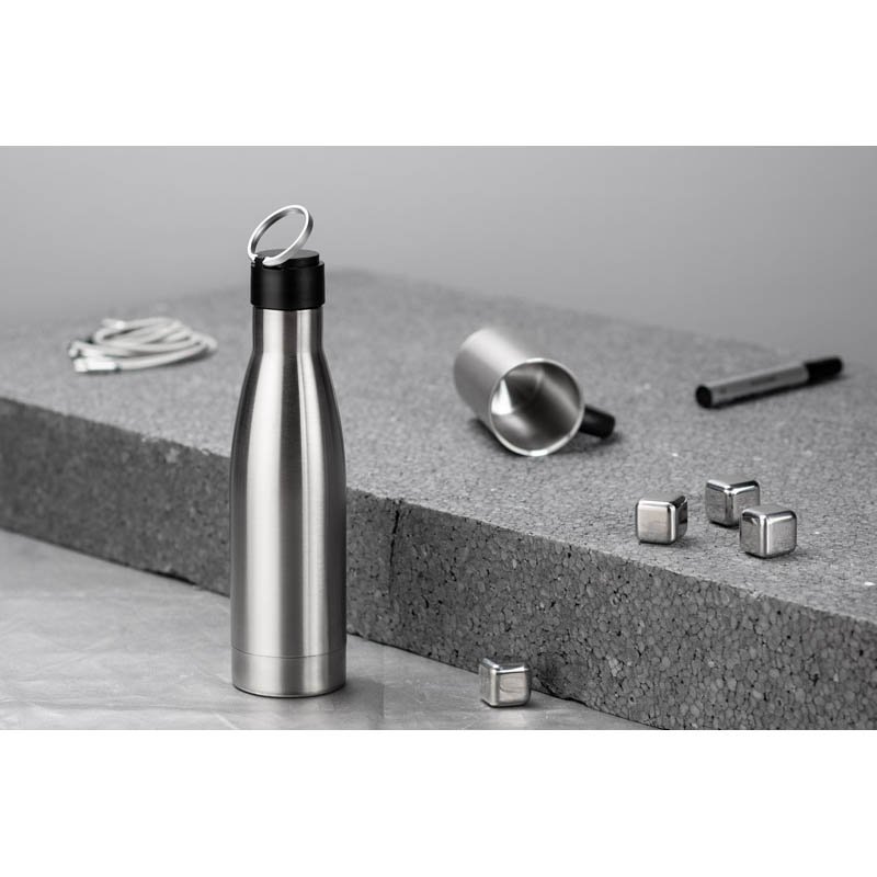 Termoska s objemom 500 ml s dvojitou stenou z nerezovej ocele a vnútornou stenou z vylepšenej ocele 18/8. Skrutkovacie viečko má úložný priestor. Súčasťou sú odnímateľné šnúrky (lanyardy) v 2 veľkostiach - na zápästie a cez rameno. Odnímateľné dno funguje