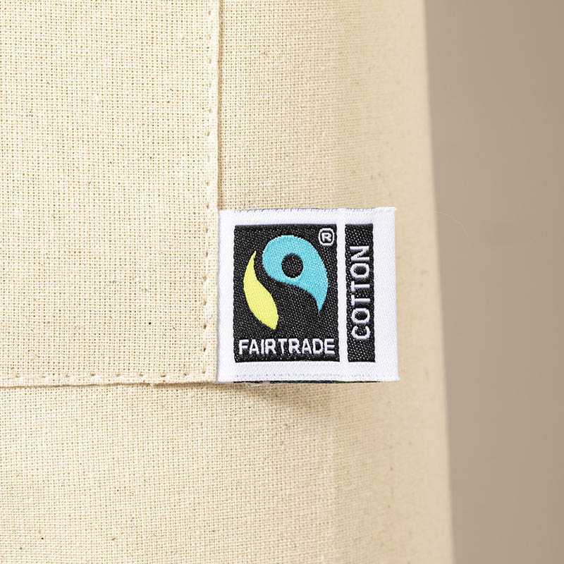 NOVINKA 2025. Nature line apron, made of cotton 180g/m2 in a natural tone. With Fairtrade certification, an alternative to the conventional trade system that pursues the development of peoples and the fight against poverty. With front pocket and drawstring, fitting below the knee. Including Fairtrade label and hangtag in recycled cardboard.