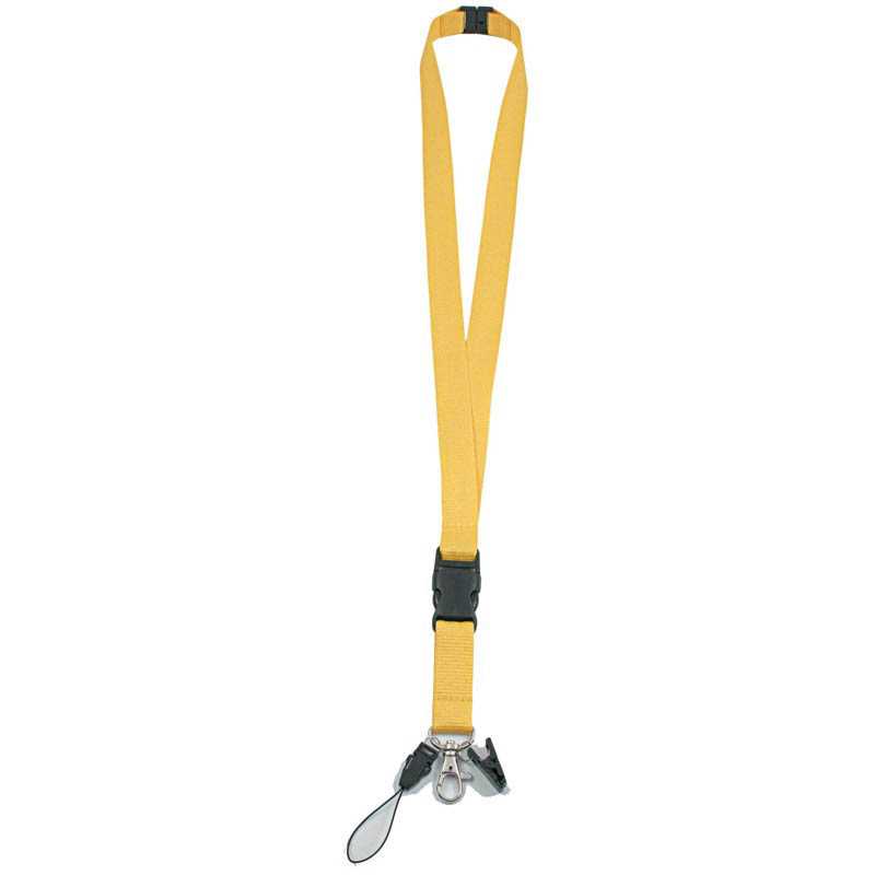 Polyesterová šňůrka s kovovou karabinou, odnímatelnou přezkou, popruhem na mobilní telefon a bezpečnostním zámkem. 20 x 510 mm