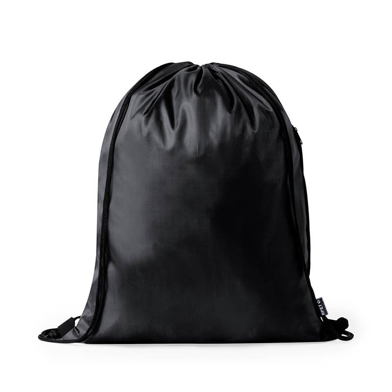 NOVINKA 2025. Drawstring backpack in soft RPET 210T polyester. With safety buckle closure and self-closing strings. Reinforced corners, metal eyelets and outside label with RPET logo. Available in a wide range of colours (white colour specially made for sublimation printing).RPET material is made from recycled plastic, thus promoting the reuse of plastic waste and helping the sustainability of the planet.