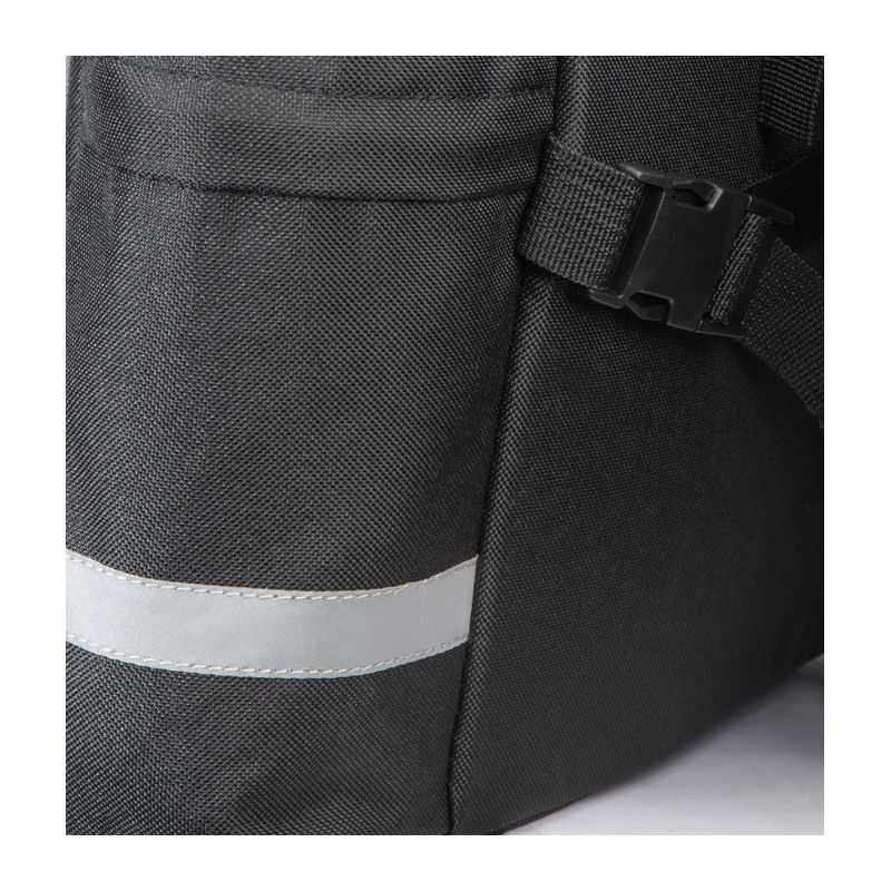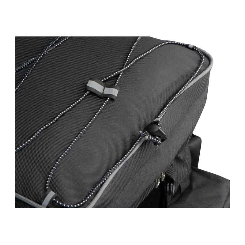 Kvalitná veľká taška na bicykel, ktorá sa upevňuje na nosič batožiny. S mnohými funkciami, ako sú elastické popruhy a niekoľko úložných priehradiek.