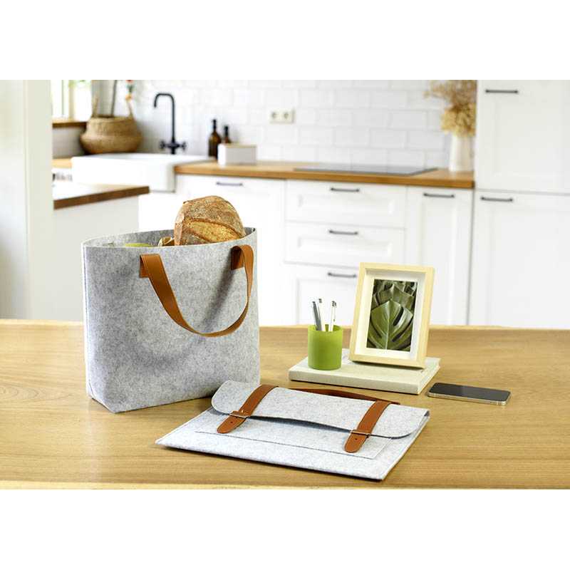 RPET felt document bag with PU details. One large compartment. The bag is closed with two buckles.