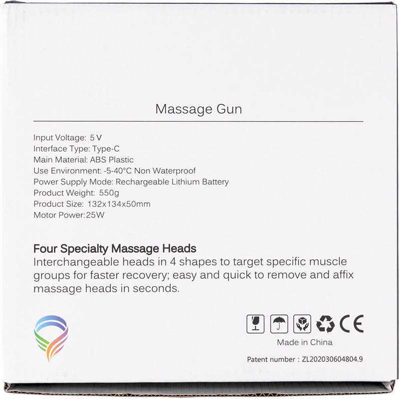 NOVINKA 2025. ABS massage gun with brush motor (speed 1.800 - 3.200 rpm) and 1.200 mAh rechargeable battery. 5V input and 6 levels of intensity to massage the muscles. Individually packaged per piece in giftbox, including 4 massage heads.
