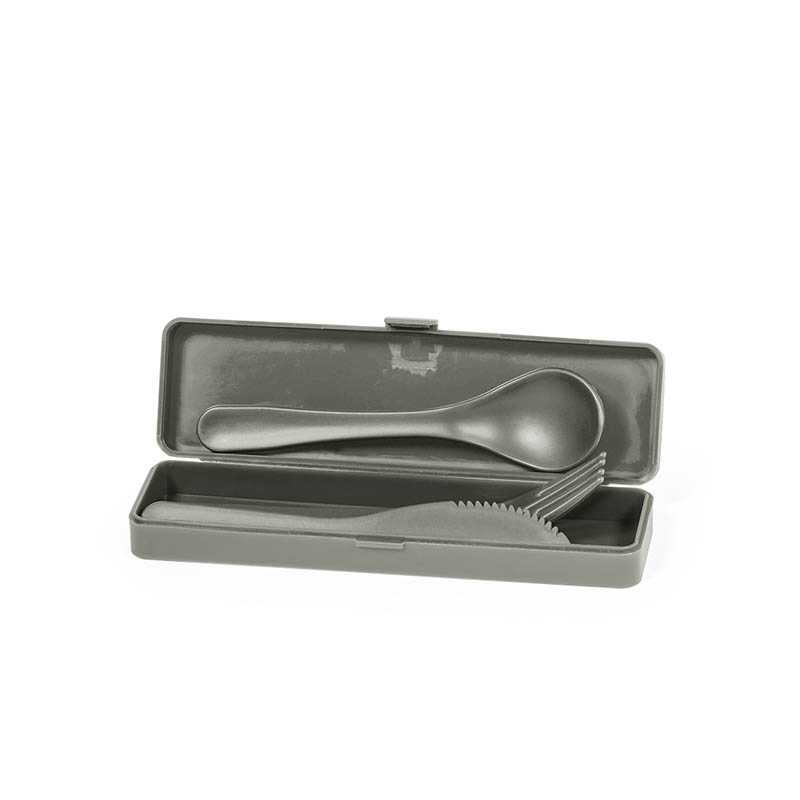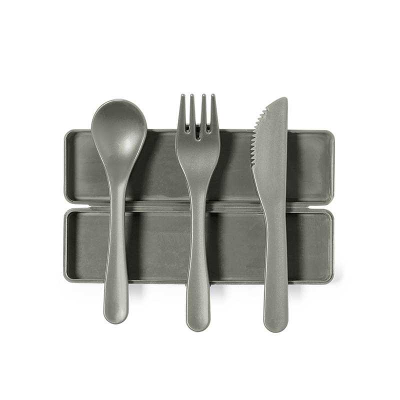 NOVINKA 2025. Cutlery set made in recycled BPA-free PP, with matching display box. Including spoon, fork and knife. Food Grade Certified, guaranteeing safety when food comes into contact with the material used to manufacture the product. Matte finish, outer case and cutlery available in a wide range of colours. Presented in an individual recycled bag.Recycled PP is a recycled and highly recyclable plastic, extremely resistant and suitable for a multitude of applications.