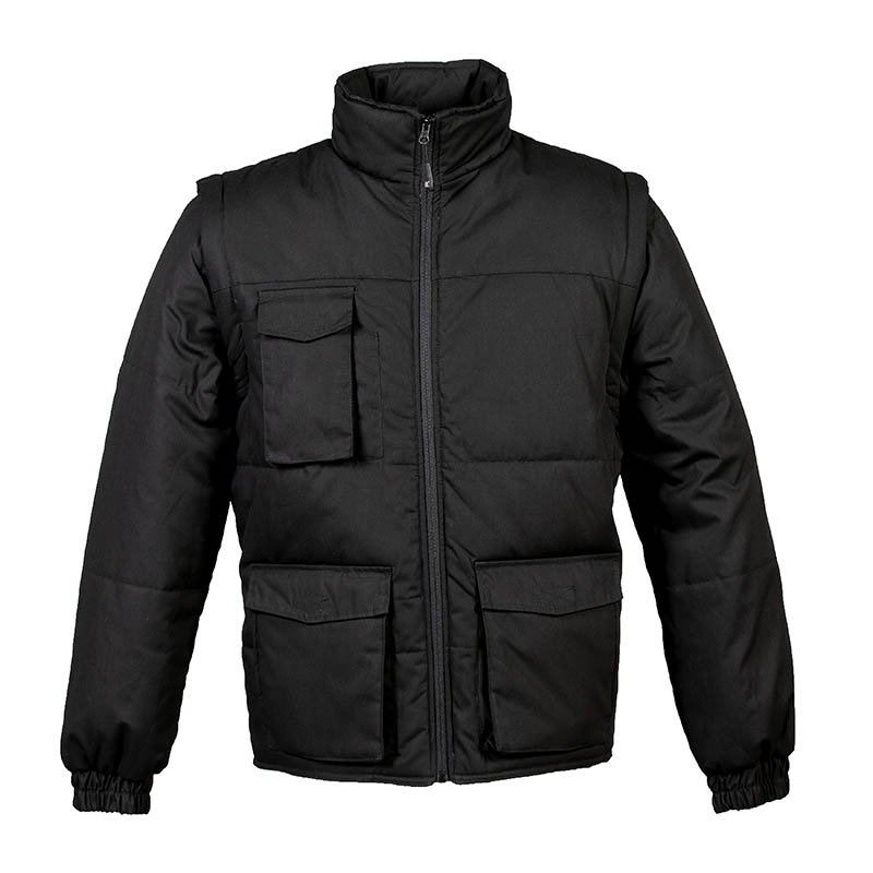 Jacket in 80% polyester 20% cotton - Polyester padding - Polyester lining - Detachable sleeves - Chest pocket with pen holder - Two pockets with zip - Two double pockets with flap and velcro closing - Inner wallet pocket with velcro closure - Elastic cuffs - One key ring hook inside pocket