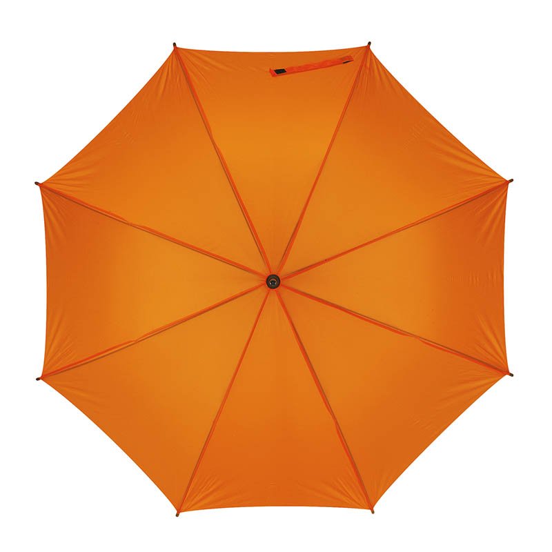 Polyester (190T) automatic umbrella with eight panels. Metal frame and wooden handle.