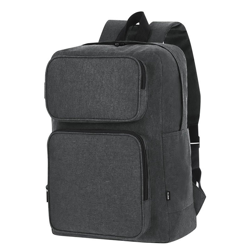 NOVINKA 2025. Backpack made from soft RPET 600D polyester. With main pocket with zipper closure and double pull. Interior pocket for a laptop of up to 15 inches and tablet of up to 10 inches. Includes two front pockets with zipper closure and a pocket on the side. Padded adjustable back and straps. Includes a transport strap for adjustment on a trolley or suitcase, ideal for travel. With RPET designation on the label.RPET material is made from recycled plastic, promoting the reuse of plastic waste and helping the sustainability of the planet.
