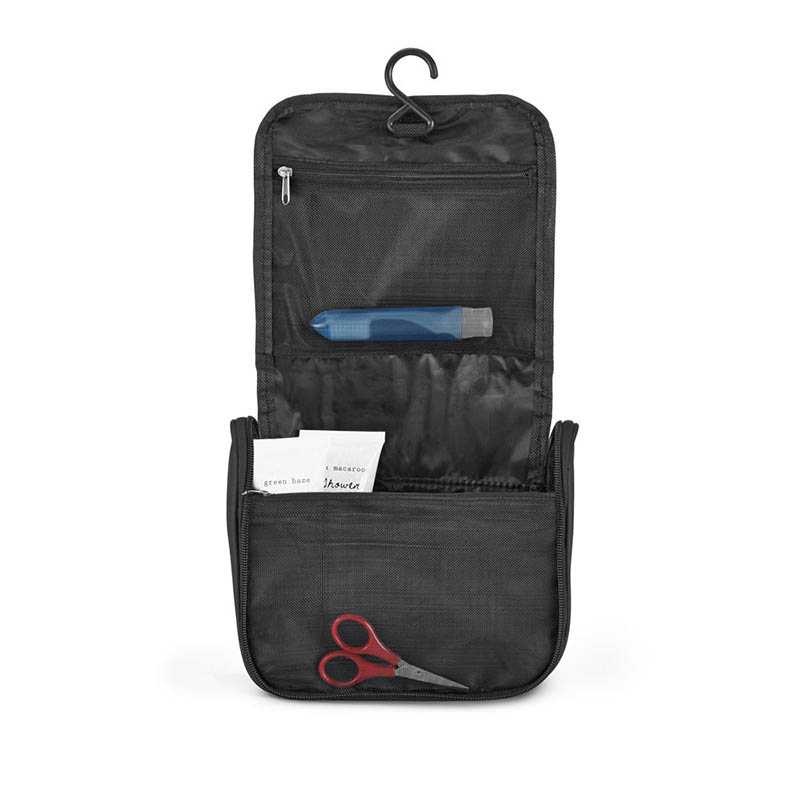 Toaletní taška z 300D s vysokou hustotou, s polstrovaným držadlem a dvojitým zipem. Vnitřek s podšívkou a kapsou na zip. 200 x 115 x 140 mm