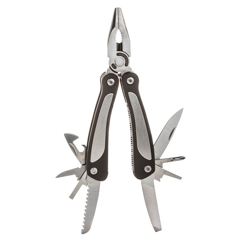 Multifunkční kleště z nerezové oceli s 9ti funkcemi: kleště, pilník, 3 šroubováky, 2 velikosti nožů, otvírák na plechovky a pilka. Dodáváno s polyesterovým pouzdrem.
