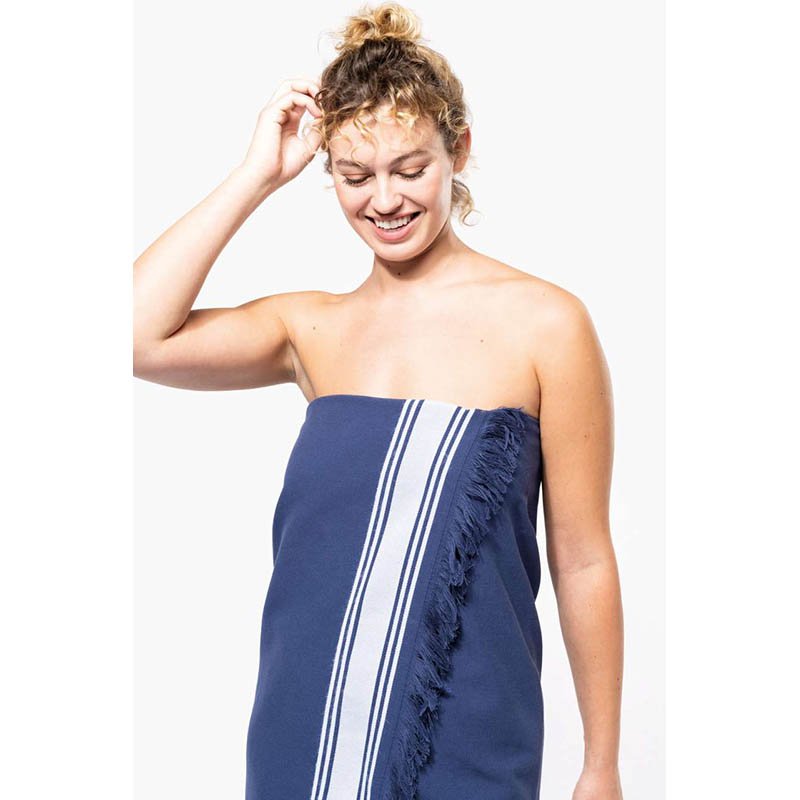 100 % bavlna.Rozměry: 180 cm x 100 cm.Z jedné strany pletený a z druhý froté povrch.Kontrastní okraj s třásněmi.Certifikace v souladu s STANDARD 100 od OEKO-TEX®N° CQ1007/6, IFTH.