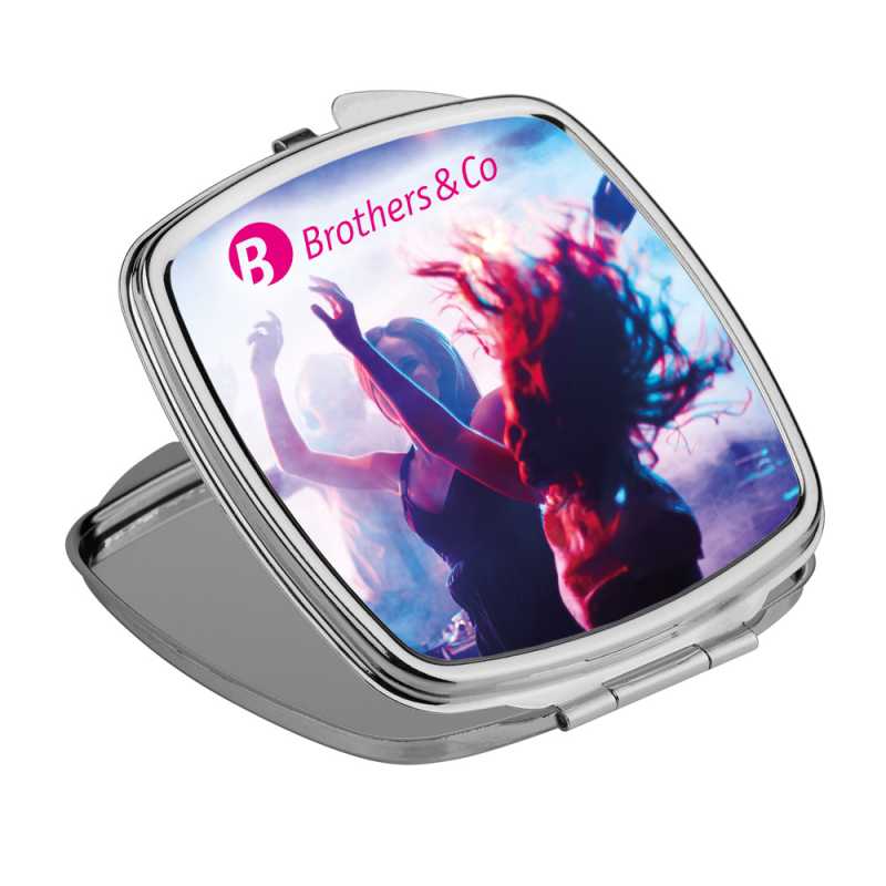 Dvoudílné kompaktní kosmetické zrcátko z kovu, praktické k použití kdekoliv potřebujete. Zrcátko je ideální pro personalizaci formou domingu. Dodáváno v dárkové krabičce. Krabička: 67 x 75 x 9 mm