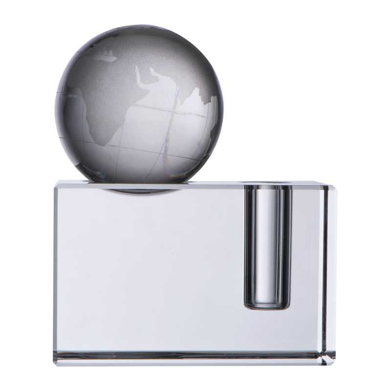 Skleněný držák na pero, Vaše logo vygravírujeme přímo na sklo. Globus je odnímatelný. Rozměry 9,5 x 5 x 8 cm. Bezpečně zabaleno v modré dárkové krabici.