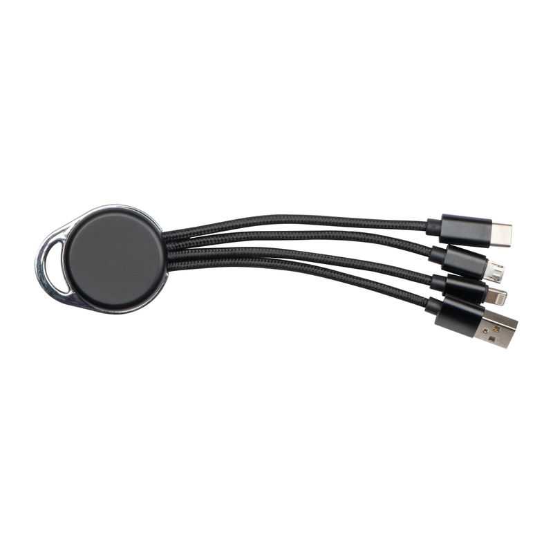 USB káblový adaptér s pripojeniami USB-A, USB-C, Micro-USB a Lightning. Náš adaptér má schopnosť osvetliť vaše individuálne logo na okrúhlom povrchu.