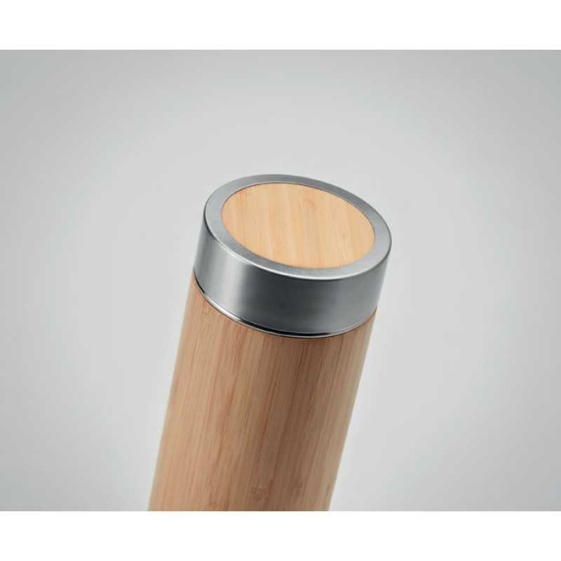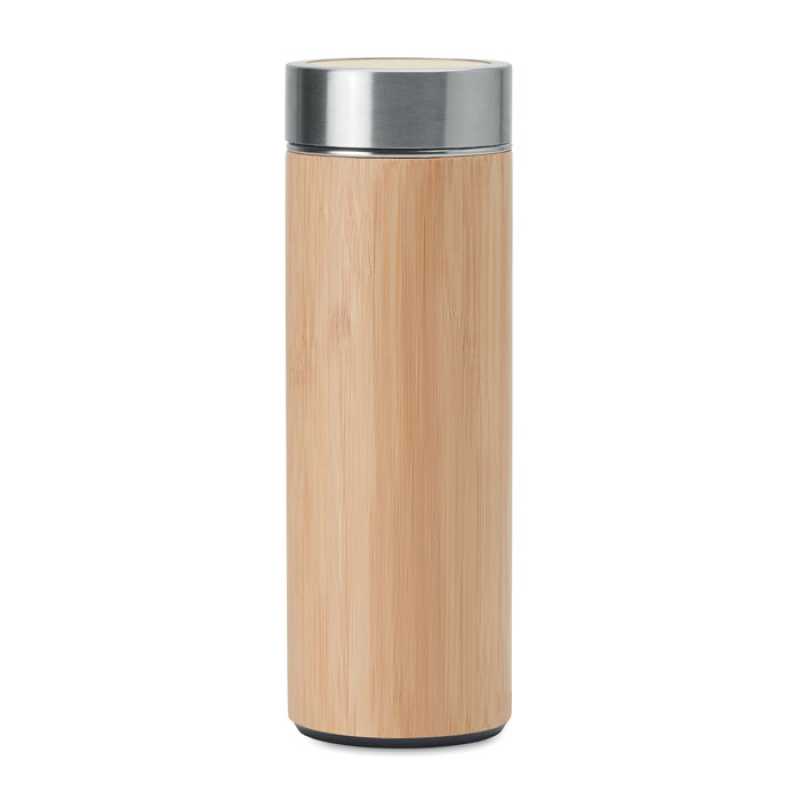 Dvoustěnná nerezová láhev s bambusovým povrchem a izolačním vakuem. 400 ml, přídavný čajový infuzer. Bambus je přírodní materiál, může dojít k mírným změnám barvy, dekorace a velikosti. Bambus je přírodní materiál, může dojít k mírným změnám barvy, dekora