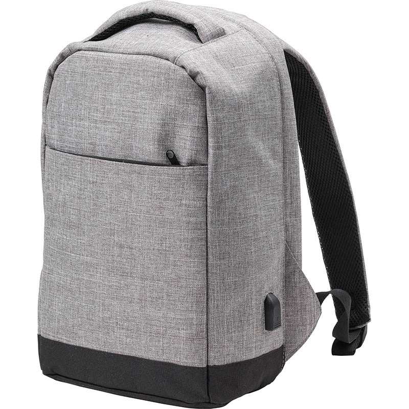 Polyester (600D) anti-theft backpack, with PVC backing. The backpack has a laptop compartment (13 inch), multiple interior pockets including a front pocket with zipper, and a USB port at the side with a cable on the inside.