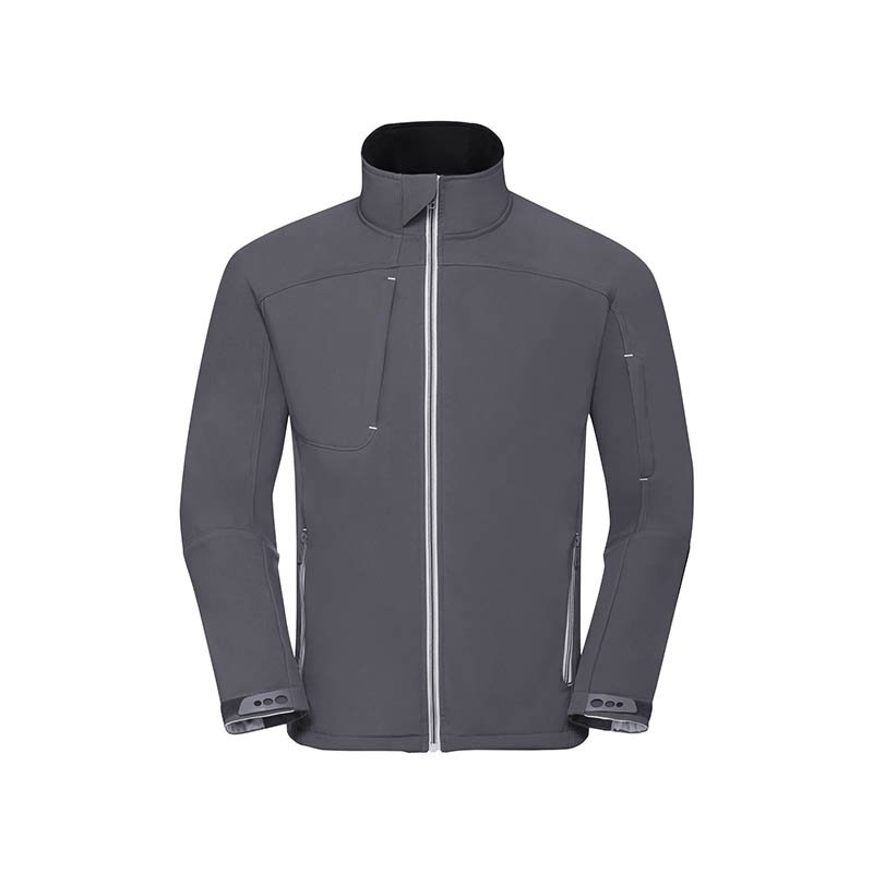 RUSSEL COLLECTION, The Russell hardwearing softshell jacket: resilient waterproof fabric and ergonomic fit with a host of features and stylish design.3 layer softshell fabric with 4 way stretch, waterproof (to 5000mm), breathable (5000g/m2 per 24 hours) and with durable water resistant Du Pont™ Teflon® coating. Značka : RUSSELL COLLECTION . Materiál : 96%PES/4%Elastane,400g/m2