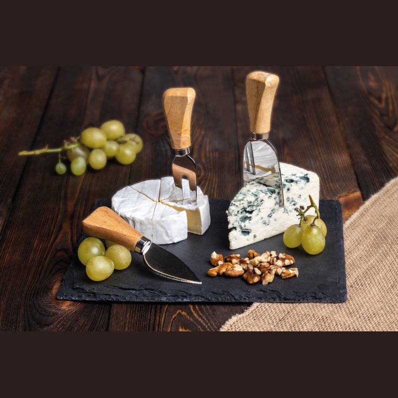 Sada na sýr v kartonové krabici, která obsahuje břidlicovou desku na krájení nebo prezentaci sýrů, jeden malý, jeden plochý nožík a jednu vidličku na sýr z nerezu. Vaše logo doporučujeme umístit na obal tampónovým tiskem nebo gravírováním na desku.
