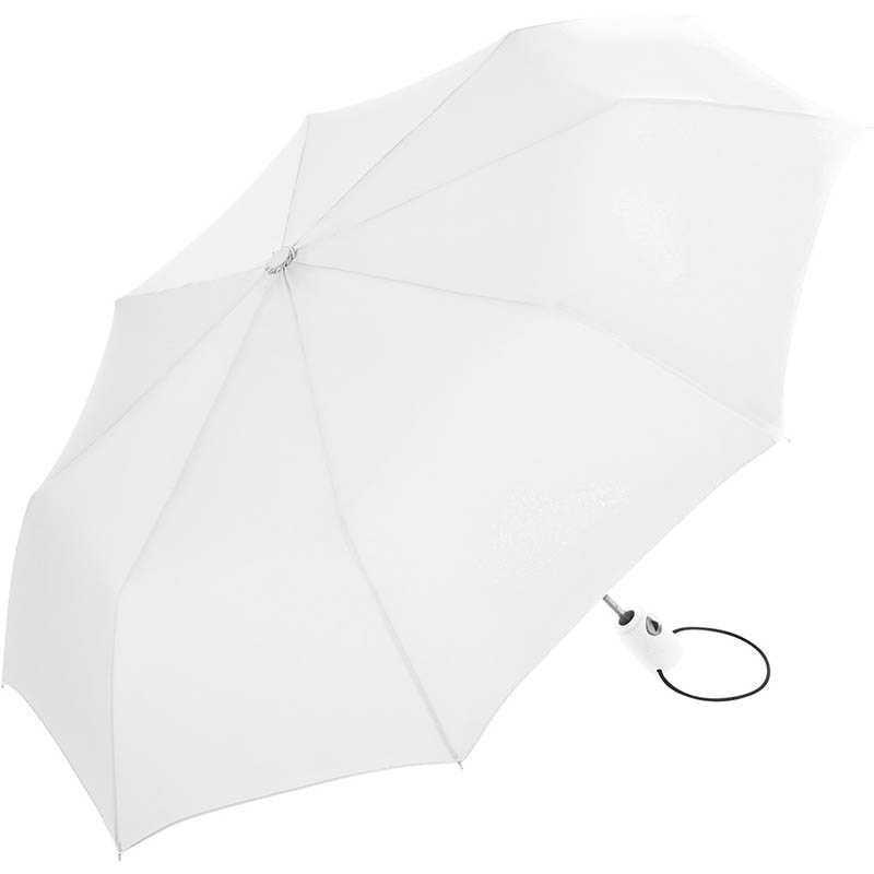 Convenient automatic open/close function for quick opening and closing, high-quality Windproof PLUS system for maximum frame flexibility in stormy conditions, depending on the colour, also available with waterSAVE® label on the closing strap (with new deliveries), chromed steel shaft, Soft-Touch handle in colour matching cover with silver push-button, elastic loop and promotional labelling option, sleeve with black piping. Also available as another mini pocket umbrella (art. 5565), as regular umbrella (art. 7560) and golf umbrella (art. 7580).