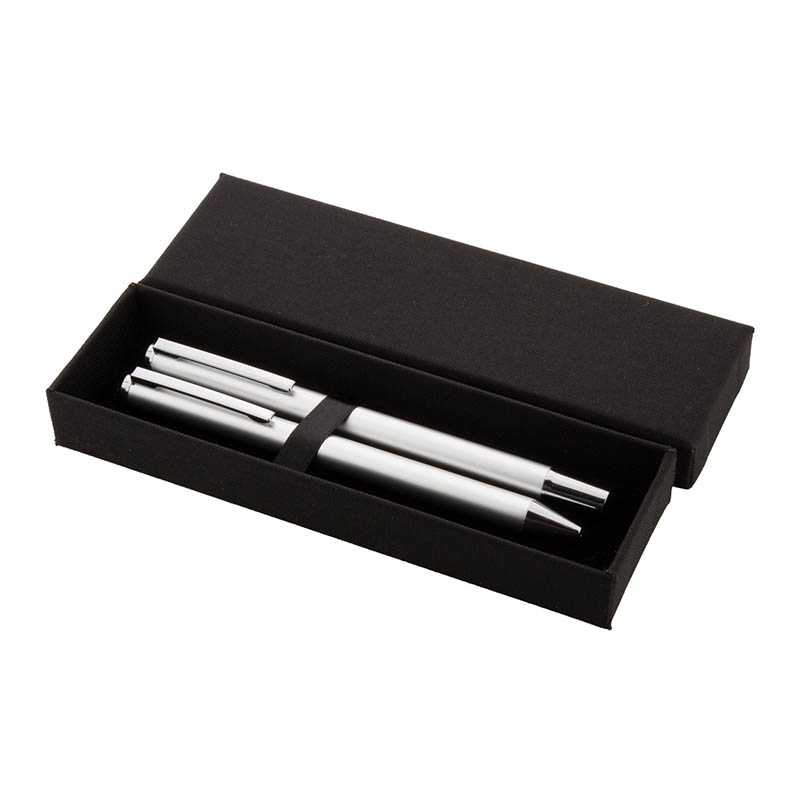 Kuličkové pero a roller s lesklým pochromovaným tělem. Dodáváno v dárkové krabičce, s modrou náplní.