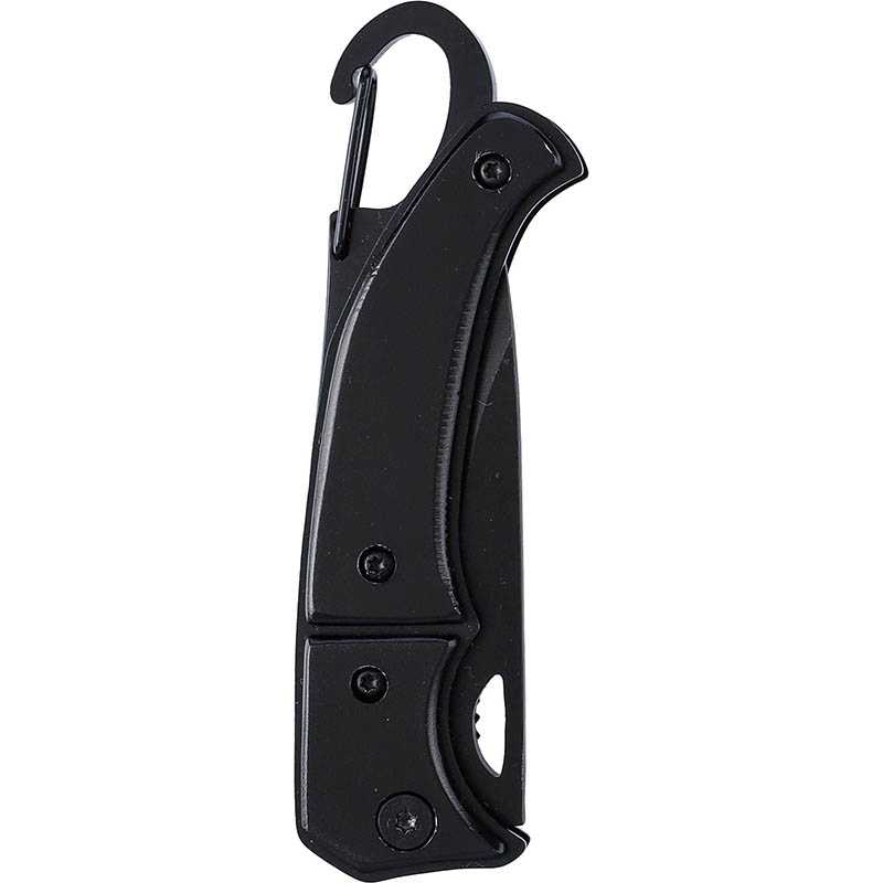 NOVINKA 2025. Stainless steel pocket knife with a safety lock, aluminum handle, and metal carabiner. Disclaimer: Carabiner not suitable for climbing. Individually packaged in a brown cardboard box.