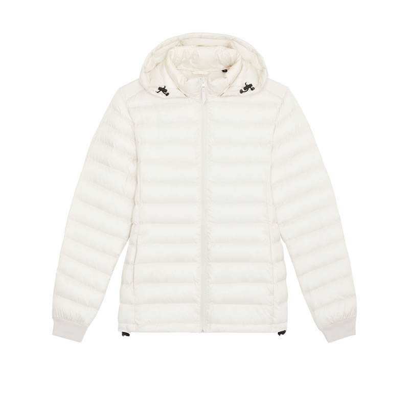 NOVINKA 2025. Set-in sleeve High collar with grown on hood Hood opening and bottom hem with adjustable plastic stopper and elastic cord Reverse nylon zip at center front Zipped welt pockets with extra grosgrain puller Fully quilted Side panels fo