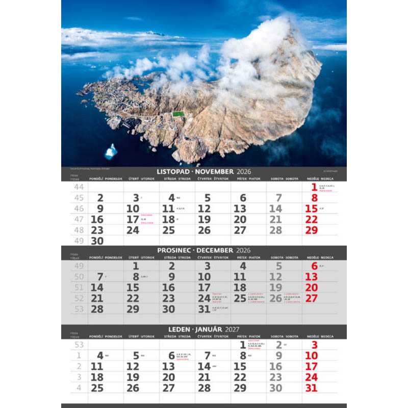 Tříměsíční kalendář Pobřeží. Formát kalendáře: 31,5 x 45 cm. Kalendárium: české a slovenské tříměsíční + svátky vybraných evropských států (CZ / SK / A / B / D / F / H / CH / I / PL / RUS / UKR). Rozsah kalendáře: 12 listů. Prostor pro přítisk: 31,5 x 7 cm
