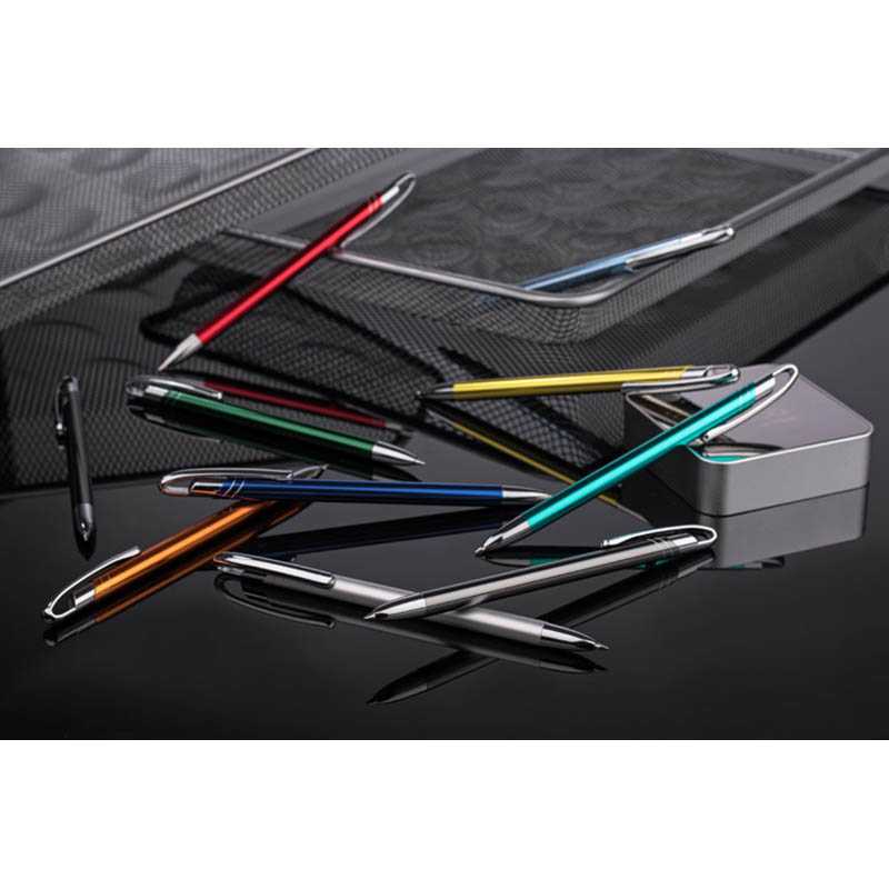 Blue ink, aluminium ballpoint pen with rubber top/pointer to operate touch screens (e.g. iPhone/iPad), matte coloured, metallic look barrel and metal clip. Give your gift more character with one of our stylish gift packaging. This pen is also known as the
