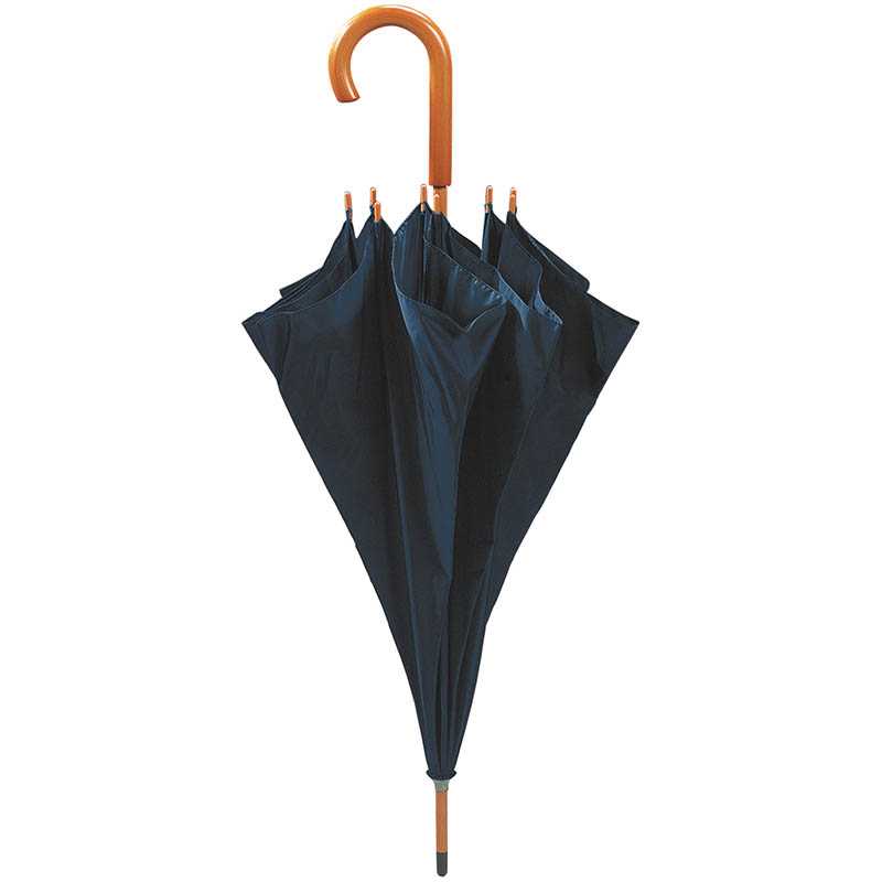Umbrella with 190T nylon canopy, metallic frame, wooden shaft, handle and velcro fastener.