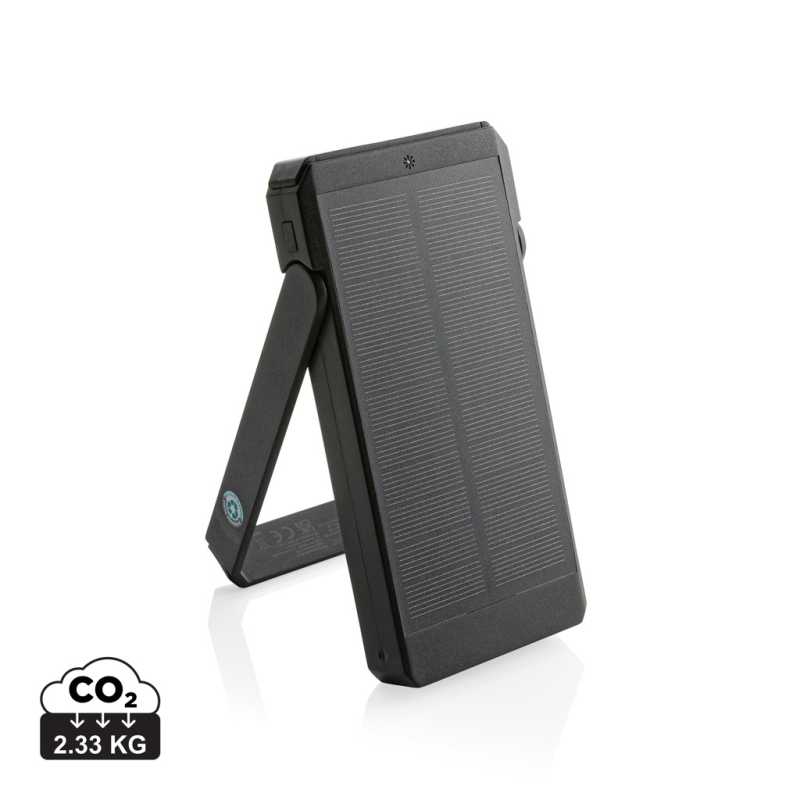 Powerbanka s kapacitou 5 000 mAh s možností solárního nabíjení. Využívá vysoce kvalitní monokrystalické solární panely s konverzním poměrem 19 %. Rychlost solárního nabíjení: 5V/130 mA. Stupeň nabíjení vždy závisí na slunečních podmínkách. Integrovaný stojánek pro nastavení ideálního úhlu. Včetně 10 W bezdrátového nabíjení. Vyrobené z RCS recyklovaného ABS. RCS (Recycled Claim Standard) je globální standard, který umožňuje ověřit použití recyklovaného materiálu v produktu napříč celým dodavatelským řetězcem. Celkový podíl recyklátu dle váhy produktu: 21 %. Včetně nabíjecího kabelu z RCS recyklovaného TPE. Baleno v FSC dárkovém balení. Vstup USB C: 5V/2A. Výstup: USB A: 5V/2A; USB C: 5V/2A. Ochranný vzor®.