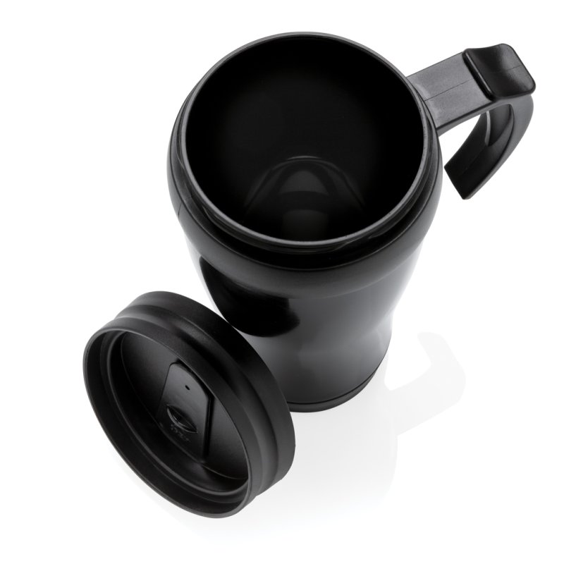 Hrnek o objemu 350 ml, vnější plášť z nerez oceli, vnitřek z PP, s černým víčkem a dnem.