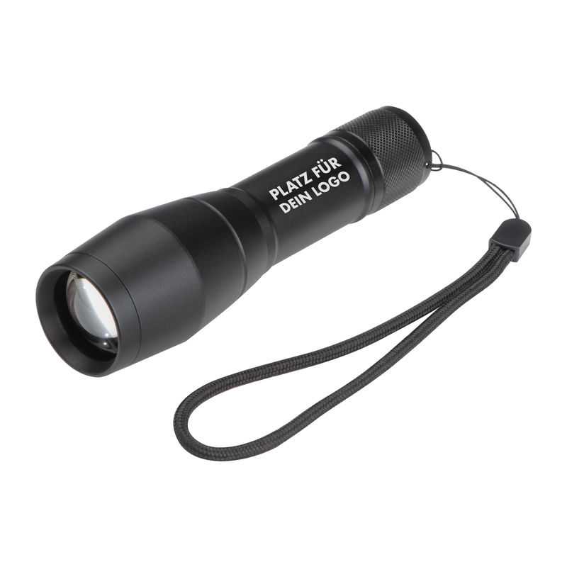 Hliníková LED baterka s rôznymi funkciami svietenia (stále svetlo, SOS a blikajúce svetlo), 10W, pútko na zápästie. Spôsob potlače gravírovanie.