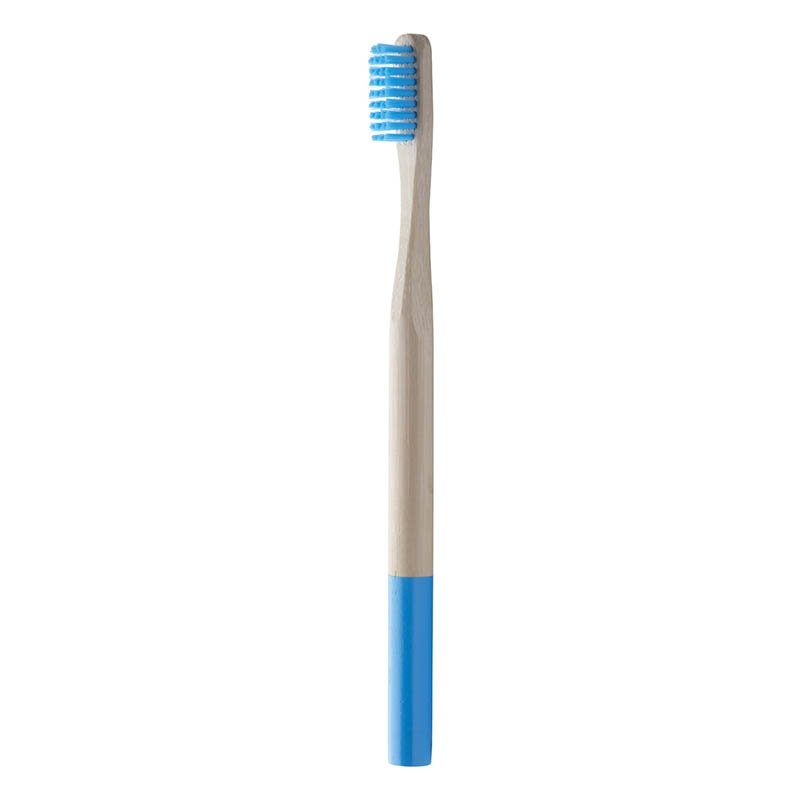 Kartáček na zuby pro dospělé z bambusu a barevnými nylonovými štětinami a barevným koncem držadla. V kraftové papírové krabičce.