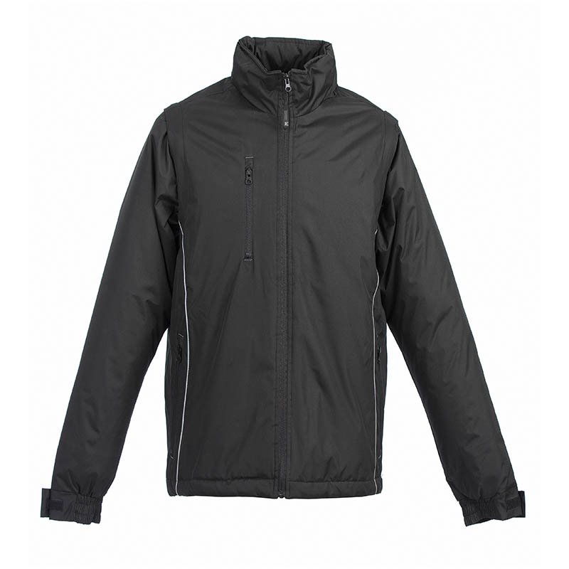 Two-Tone Quilted Softshell Hooded Jacket. Made of three-layered quilted fabric and softshell fabric in sides, hood, sleeves and yoke. Stand-up collar with double layer hood and full-zip front closure for warmth and comfort. Adjustable cuffs with rubber fastening with hook function (mushroom system) and straight-cut waist with adjustable elastic drawstring and stopper for a better fit and added comfort. Two vertical zippered waist pockets and an inner velcro pocket for a secure and convenient storage. Includes an inside back zip for easy marking with different methods: screen printing, embroidery, transfer printing, shields, vinyl application. Ideal as workwear, sportswear and promotional clothing.