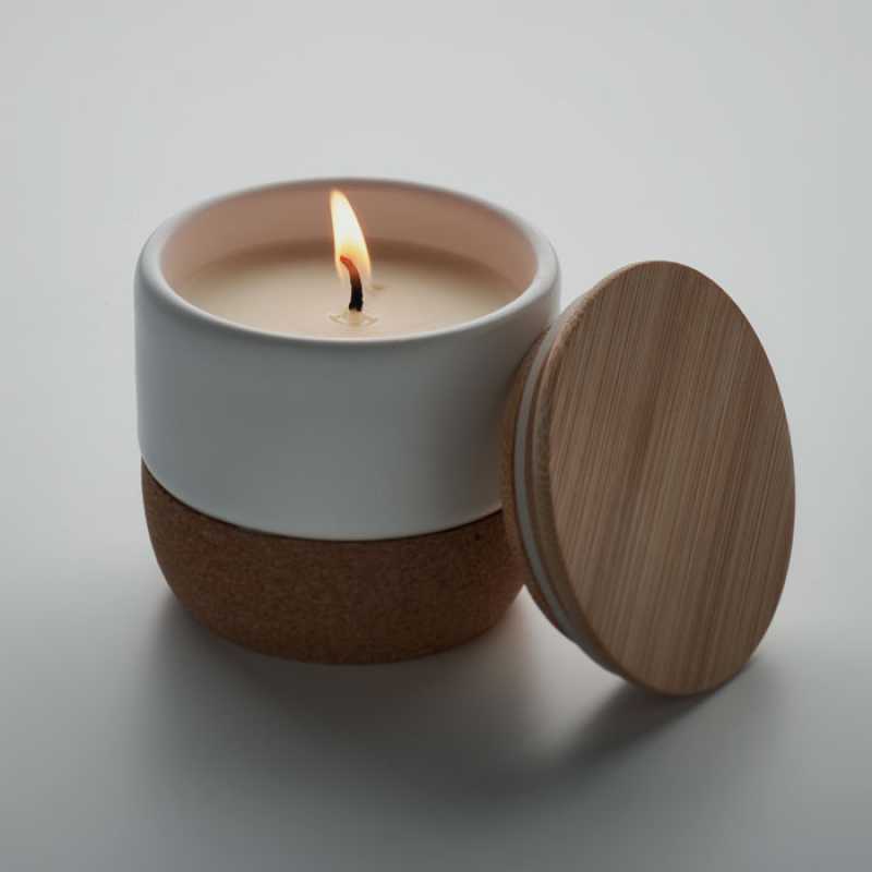 Rostlinná vosková svíčka s vůní vanilky v keramickém stojánku se dnem z přírodního korku a bambusovým víčkem.