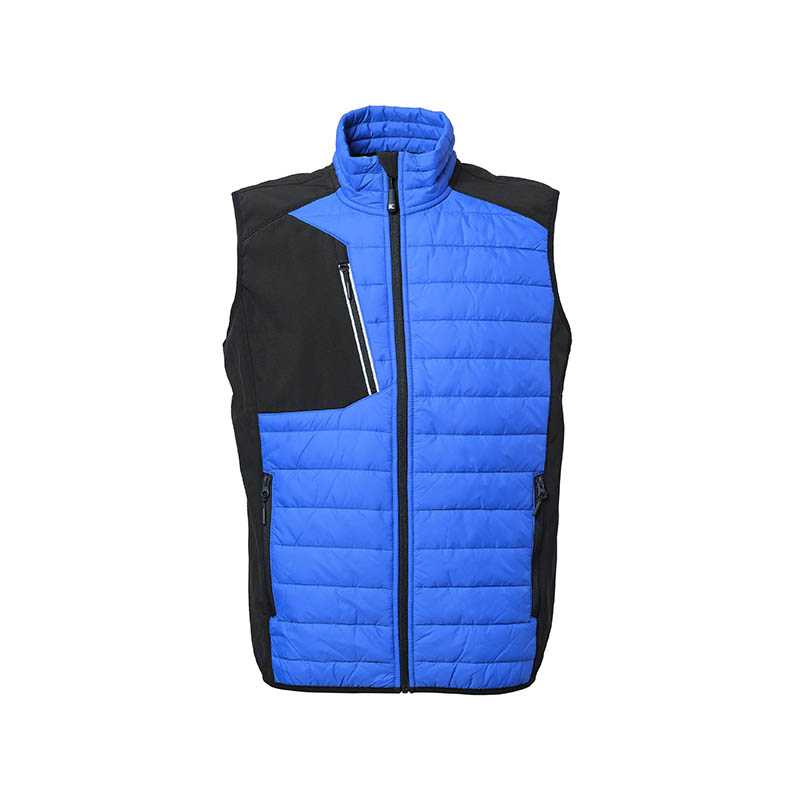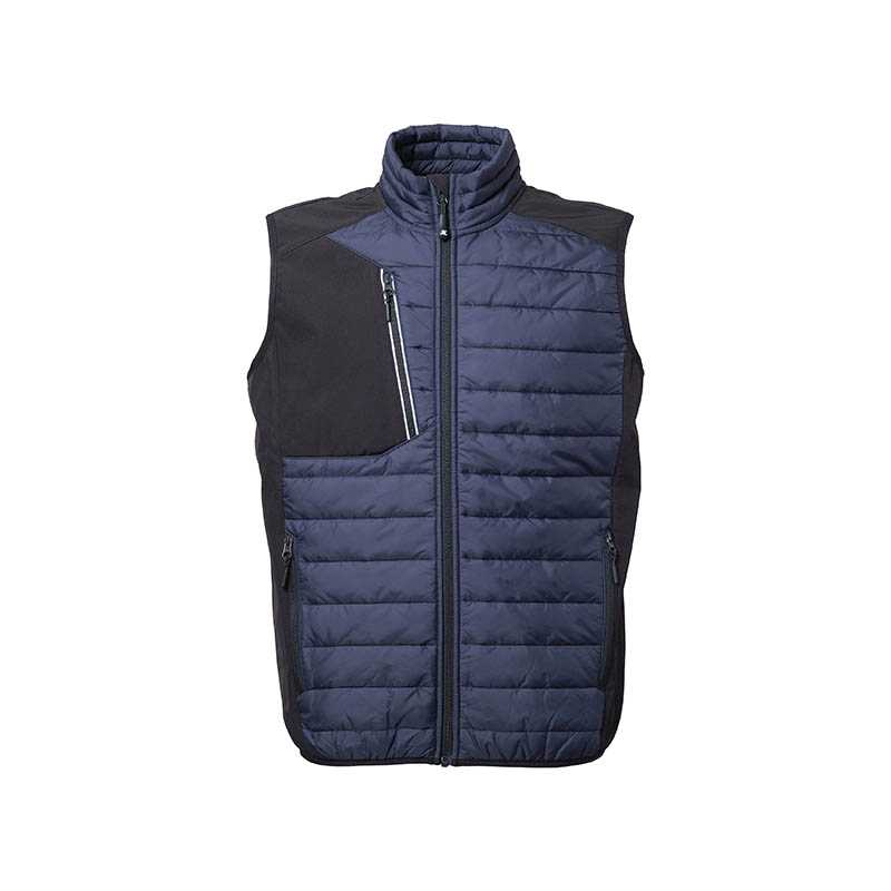NOVINKA 2025. WAISTCOAT IN COMPOSITE FABRIC - Main fabric in soft 310T nylon taffeta with water-repellent treatment. - Polyester padding - Polyester lining with mesh on the side front and polyester in the back - Secondary fabric on shoulders and hips in black 3-layer softshell in 95% polyester - 5% elastane, Waterproof 8000 mm/H2O Breathability 1000 g/M2/24h anti-pilling fleece interior - YKK taped zippers - Two external zip pockets - One chest pocket with taped zip refractive - Reflective piping along the rear side - Internal neck reinforcement tape with coat hanger - Central zip with internal windproof fabric - Fabric to protect the chin - Elastic fabric in the armholes and at the hem