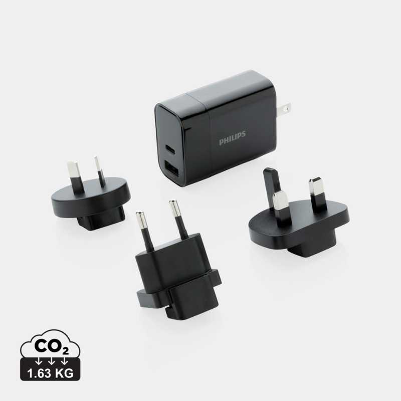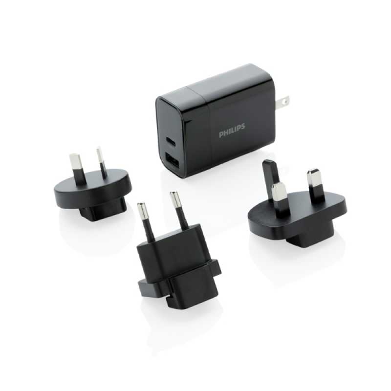 Super rychlý 30W cestovní adaptér s 4 typy zástrček (EU, UK, US, AU) v cestovním pytlíku. Vstup: 100-240V. Výstup USB C (PD): 5V/3A,9V/2A,12V/1,5A; USB: 5V/2,4A. Celkový výkon: 30 W. Baleno v dárkové krabičce Philips.