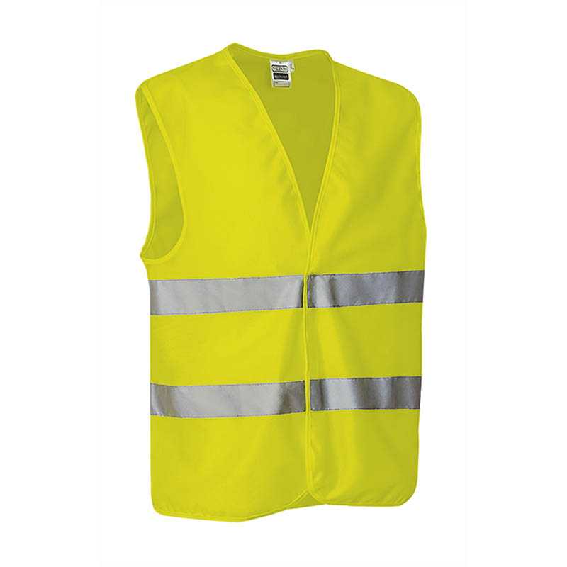 Vesta z vysoce viditelného 100% polyesteru certifikovaná podle normy EN ISO 20471 třídy 2. Reflexní vesta se 2 vodorovnými reflexními pruhy a předním zapínáním na smyčku. Jedna velikost: 670 x 700 mm
