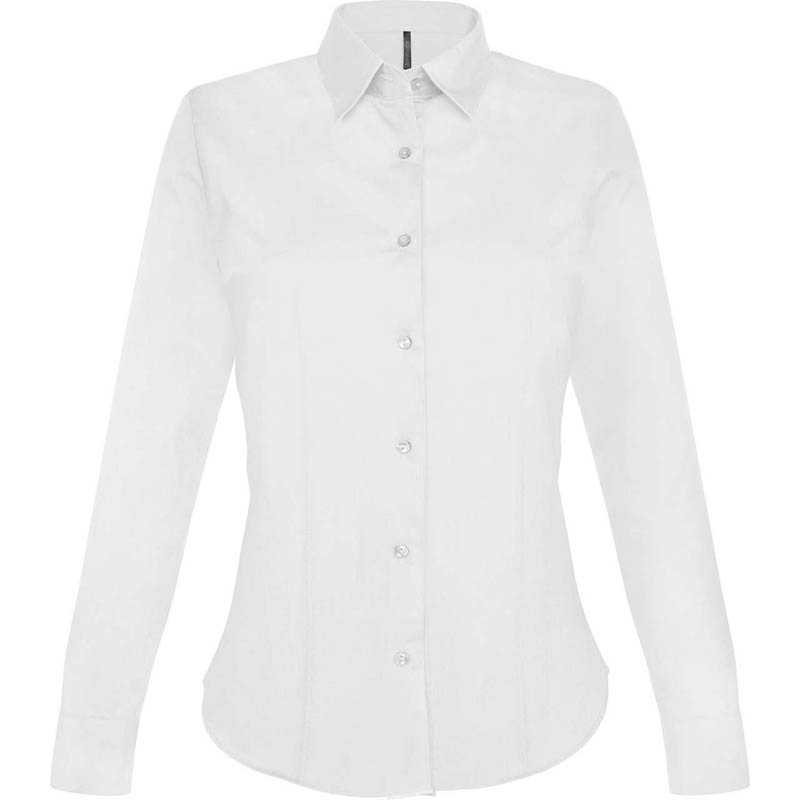 Front buttons Shirt collar Buttoned cuffs Spare button Darts at front and tailored darts at back Yoke Stretch fabric