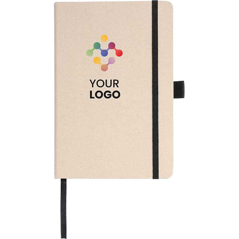 NOVINKA 2025. Sugarcane notebook (approx. A5) with 80 lined pages (80 gsm) made from sugarcane. With an elastic band, pen loop, and ribbon marker. Embossed sugarcane logo on the backside.