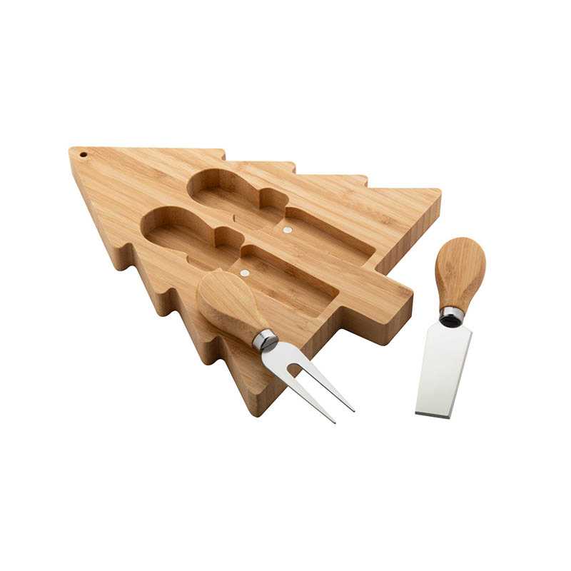Sada bambusových nožů na sýr ve vánočním designu s prkénkem ve tvaru vánočního stromku a 2 nerezovými noži na sýr. V kraftové papírové krabici.