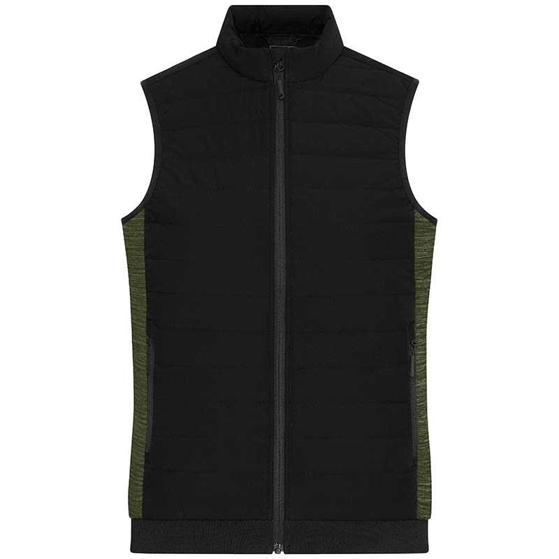 Polstrovaná vesta v zajímavé kombinaci materiálů Přední a zadní díl je prošitý, boky jsou strečový fleece Teplá a prodyšná, vytepleno soronou®AURA (obnovitelná surovina) Zip po celé délce, límec stojáček 2 boční kapsy na zip, 2 vnitřní kapsy Značkové zipy