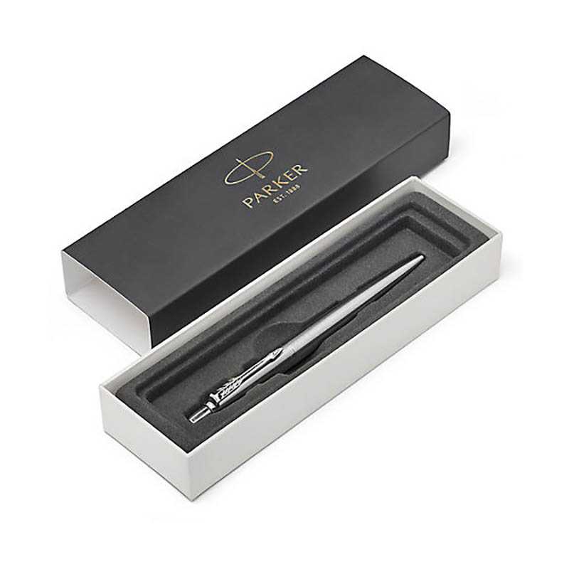 Stainless steel Parker Jotter XL ballpen. Blue ink. The XL Jotter is longer, wider, and heavier than the Original which people with larger hands prefer to write with. Pen pre-packaged in giftbox.