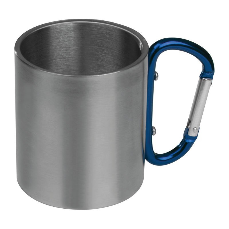 Dvouplášťový nerezový hrnek, rukojeť ve tvaru karabiny. 220 ml.