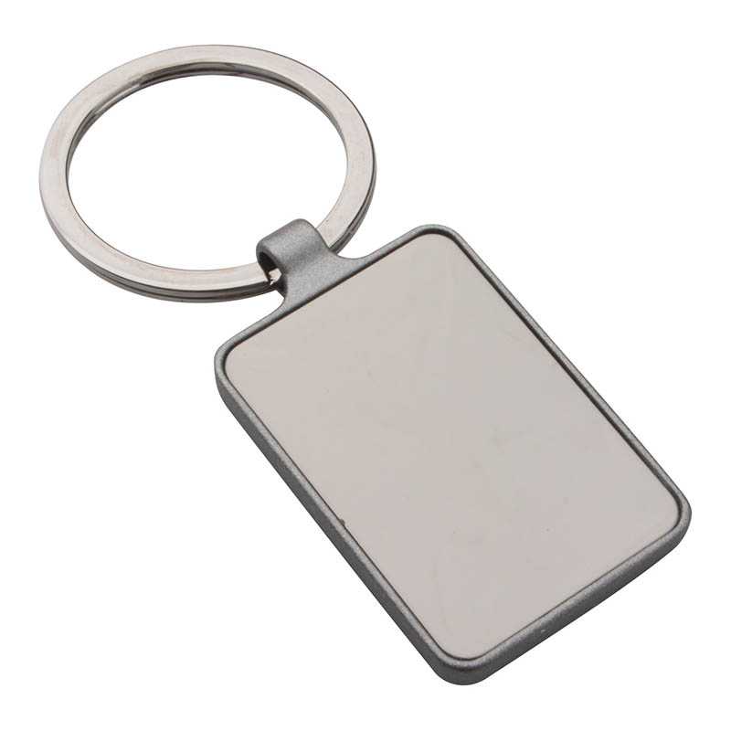 Obdélníkový přívěšek na klíče v barvě gun metal s oboustranným lesklým povrchem.