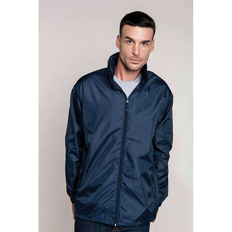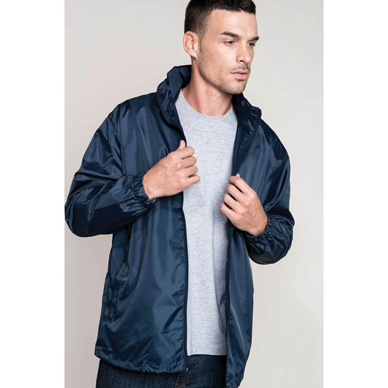 UNISEX Windbreaker. Taffeta. 100% Polyester. 70 g/m2 Water repellent Concealed hood in collar. Foldable on itself in pocket Full front zipper with puller 2 zipped side pockets To